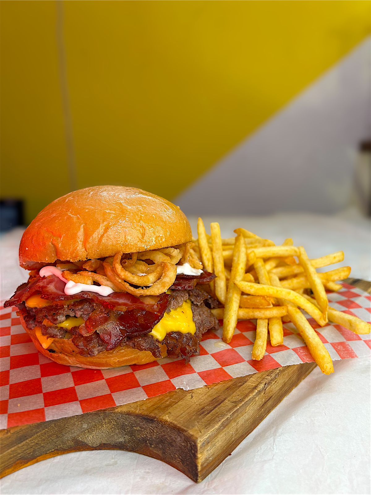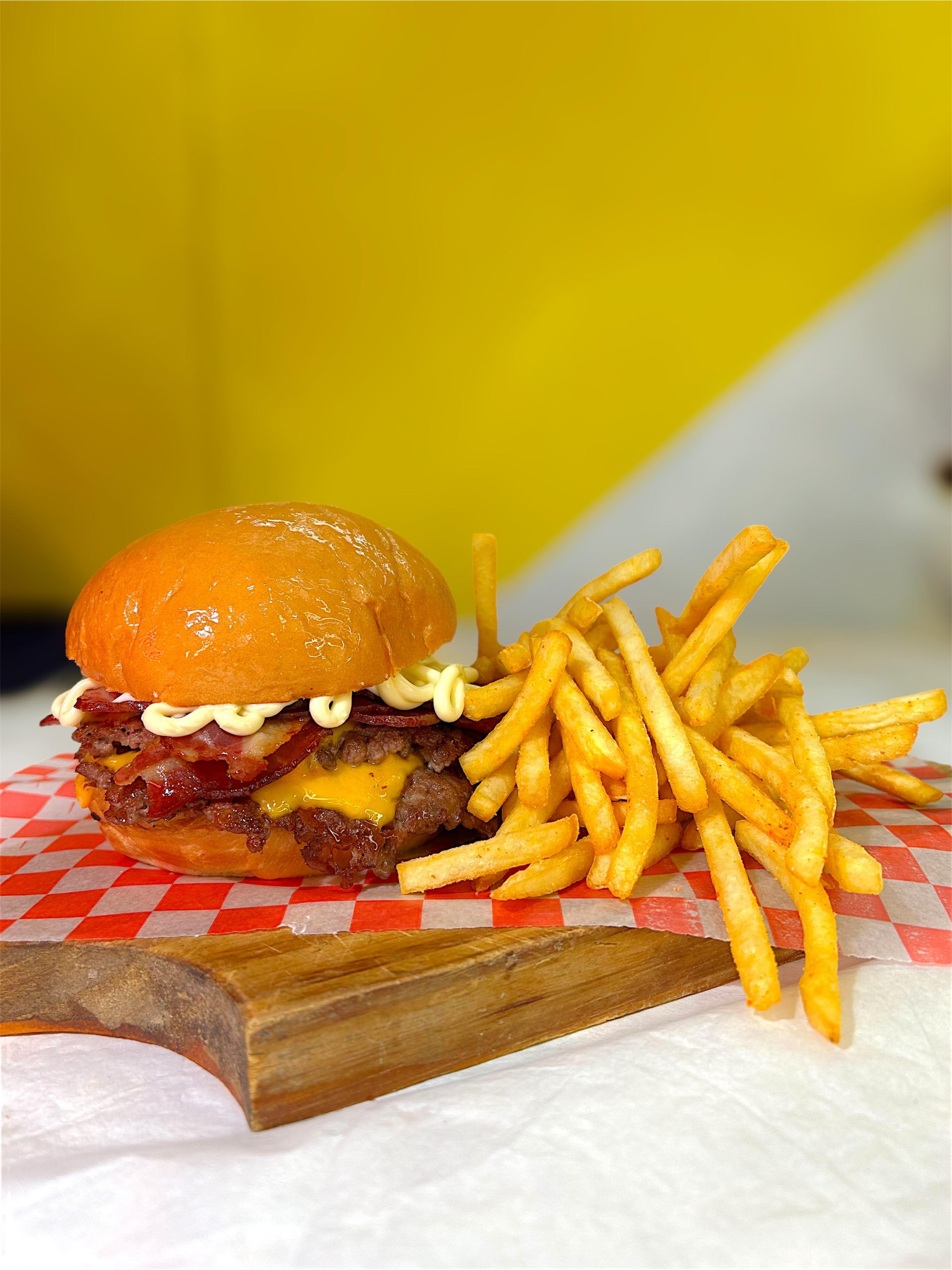 Medallón, Cheddar, Bacon, Cebolla crispy, Mayoajo, Pan de papa.